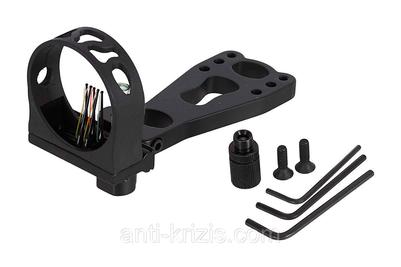 Приціл для луків-2002-5 pin Приціл для луків-2002-5 pin недорогий варіант п'ятипінового прицілу для блокових луків. Ця бюджетна модель проста, позбавлена «наворотів», але водночас має все необхідне для того, щоб забезпечити вам точну прицільну стрільбу. Піни виконані знімними, ви можете переставляти та знімати їх за вашим бажанням. Виробляти настроювання прицілу. Переробити його в три- або однопіновий. Піни зроблені з опволікну та під час прицілювання контрастно підсвічуються завдяки навколишньому освітленню. Для встановлення за вертикаллю або горизонталлю треба послабити кріпильні гвинти (ключі йдуть у комплекті) і перемістити приціл у потрібне положення. Для полегшення цього процесу на кріплення прицілу нанесена розмітка. Налаштувавши приціл, затягніть гвинти. Ви можете бути впевнені, що ваші параметри не зіб'ються під час транспортування та стрілянини. Приціл для луків-2002-5 pin — простий, але функціональний прицільний пристрій для вашого блокового лука.